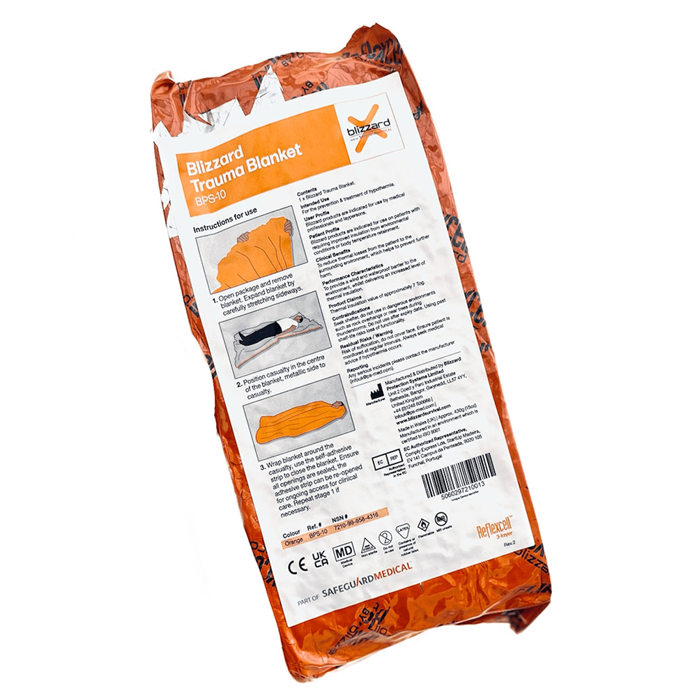 La manta de trauma de 3 capas Blizzard es el nuevo estándar en protección térmica para heridos. Esta manta extragrande envuelve al herido y se sella con un cierre autoadhesivo. Se puede reabrir fácilmente para examinar al herido o para una intervención médica.